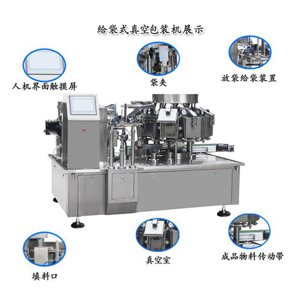 1、全自動旋轉(zhuǎn)式給袋真空包裝機由兩種分離的旋轉(zhuǎn)式機體組成(分別為充填系統(tǒng)和真空系統(tǒng));